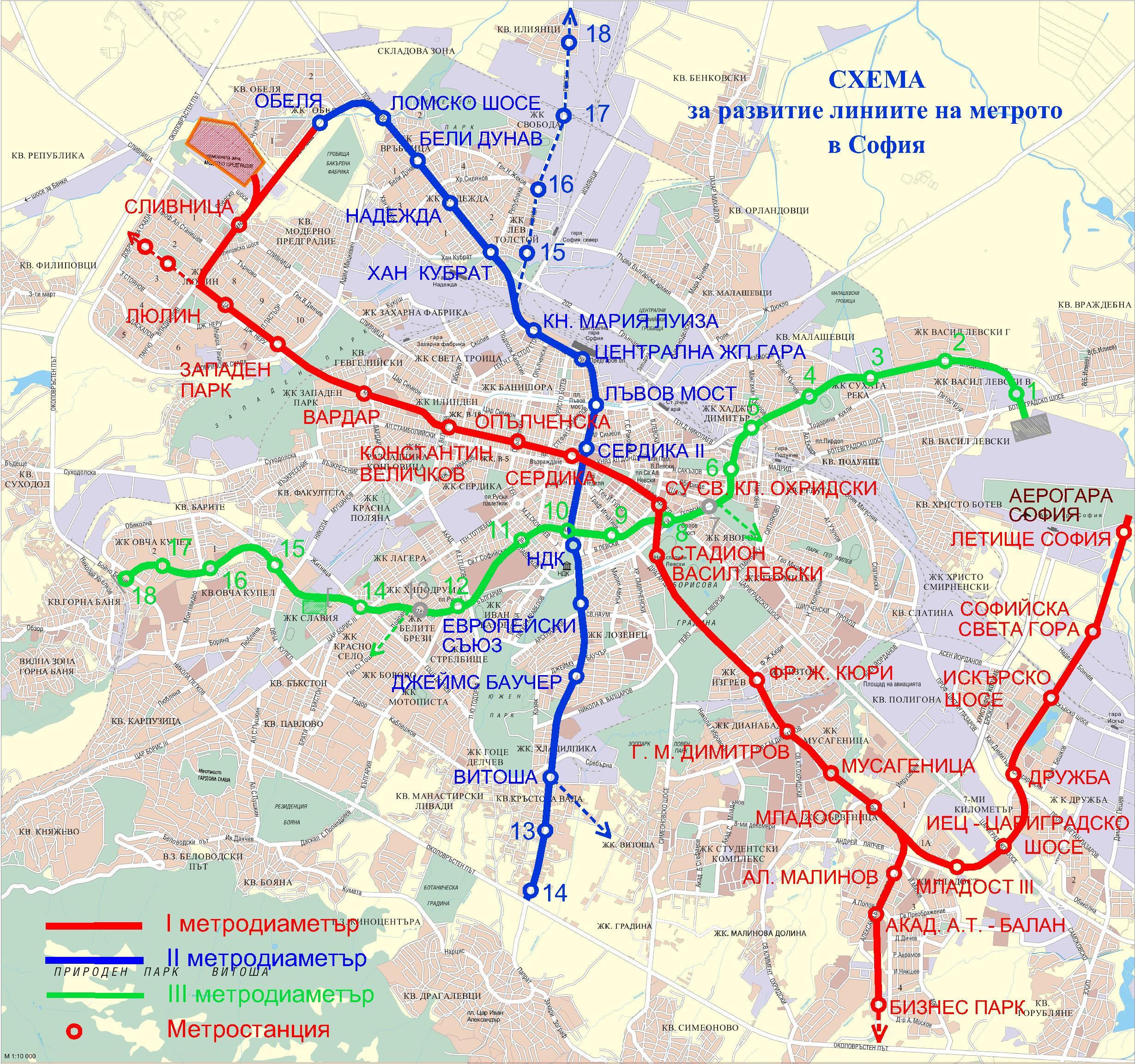 Първият диаметър „ж. к. Обеля - ж. к. Люлин - Център - ж. к. Младост - ж. к. Дружба - Летище" ще има дължина 29 км и 27 станции.